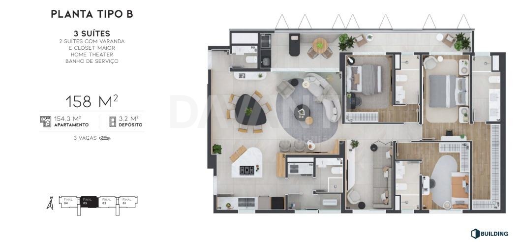 Apartamento à venda na Vila Brandina em Campinas na Davanti Imóveis. Lançamento Avenida 105 no novo bairro planejado Casa Figueira em Campinas. Essa planta possui 158m², 3 suítes (2 com varanda e closet). O Avenida 105 é o primeiro empreendimento do bairro Casa Figueira, próximo ao Shopping Iguatemi. Torre única com 80 apartamentos e 4 coberturas duplex, oferecendo plantas amplas e funcionais. Projeto inovador assinado por Renato e Lilian Dal Pian, com fachada dinâmica em brises metálicos perfurados, que favorecem o conforto térmico e a eficiência energética. Paisagismo de Ricardo Cardim, com espécies nativas da Mata Atlântica, como jabuticabeiras e pitangueiras. Área de lazer completa: piscina, espaço gourmet, salão de jogos, academia, coworking, brinquedoteca, casa de festas com piscina privativa, horta comunitária, espaço pet e áreas de relaxamento. Venha viver momentos inesquecíveis em um imóvel que combina elegância, conforto e praticidade. Visite o decorado, agende sua visita com a Davanti Negócios Imobiliários.