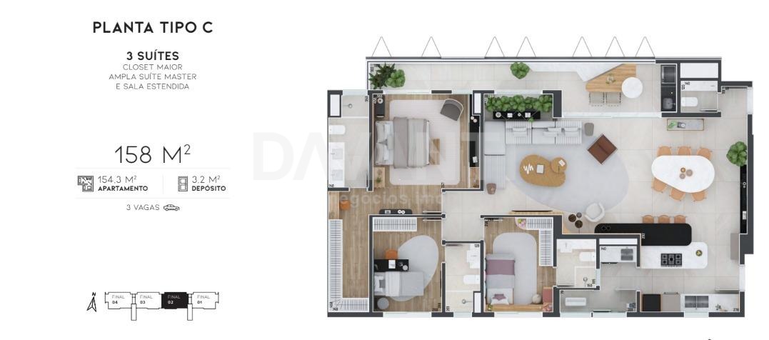 Apartamento à venda na Vila Brandina em Campinas na Davanti Imóveis. Lançamento Avenida 105 no novo bairro planejado Casa Figueira em Campinas. Essa planta possui 158m², 3 suítes (2 com varanda e closet). O Avenida 105 é o primeiro empreendimento do bairro Casa Figueira, próximo ao Shopping Iguatemi. Torre única com 80 apartamentos e 4 coberturas duplex, oferecendo plantas amplas e funcionais. Projeto inovador assinado por Renato e Lilian Dal Pian, com fachada dinâmica em brises metálicos perfurados, que favorecem o conforto térmico e a eficiência energética. Paisagismo de Ricardo Cardim, com espécies nativas da Mata Atlântica, como jabuticabeiras e pitangueiras. Área de lazer completa: piscina, espaço gourmet, salão de jogos, academia, coworking, brinquedoteca, casa de festas com piscina privativa, horta comunitária, espaço pet e áreas de relaxamento. Venha viver momentos inesquecíveis em um imóvel que combina elegância, conforto e praticidade. Visite o decorado, agende sua visita com a Davanti Negócios Imobiliários.