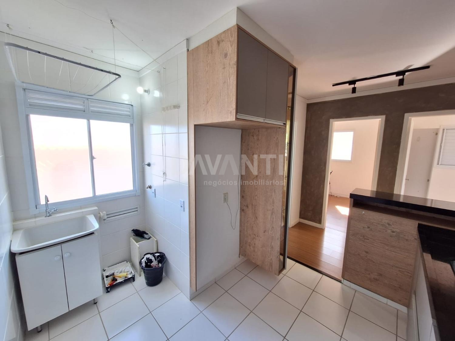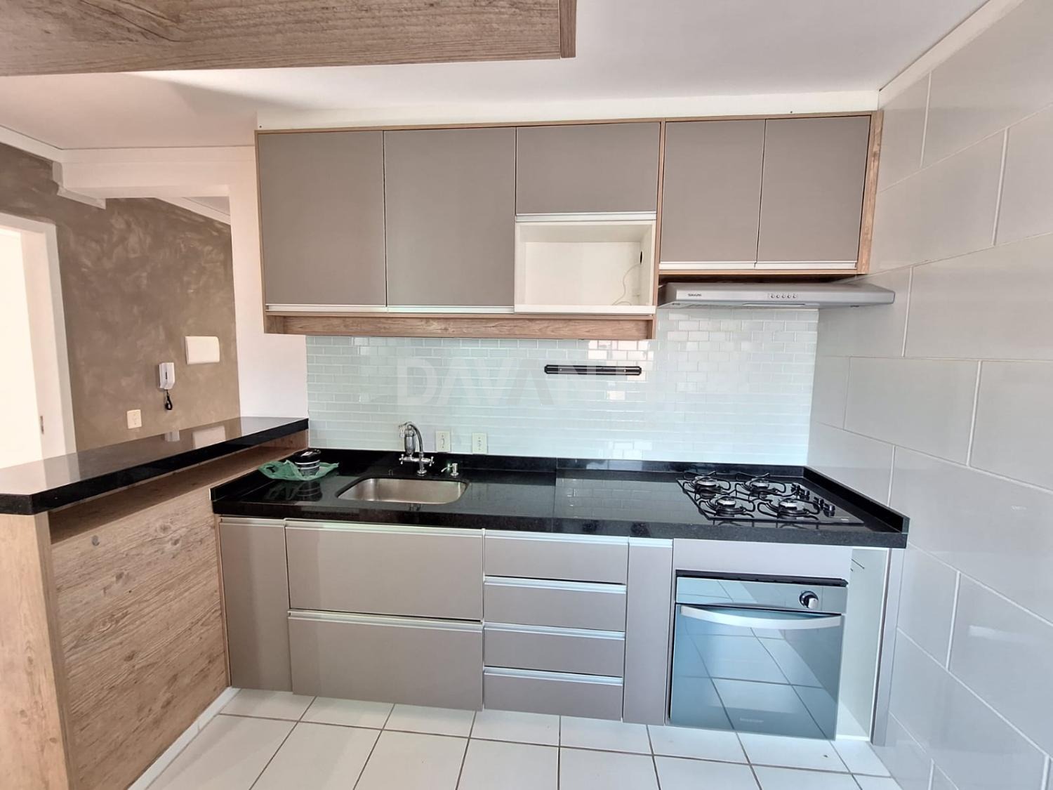 48m², sala integrada com painel de TV planejado, 2 quartos com armários, cozinha americana com armários planejados, forno e fogão.