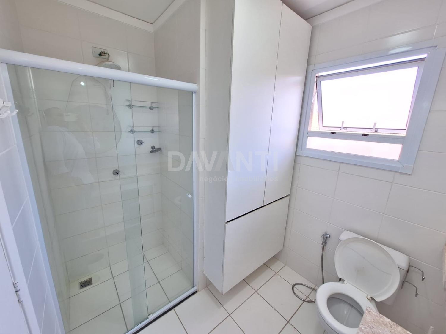Banheiro com box em vidro e armário.