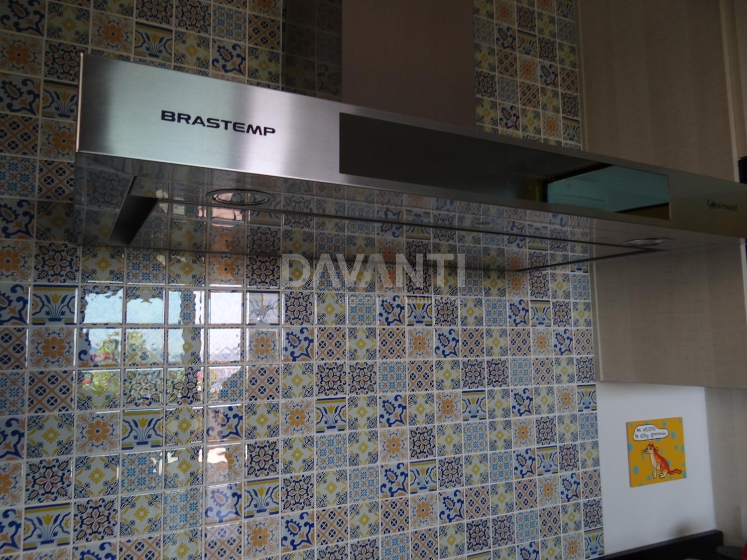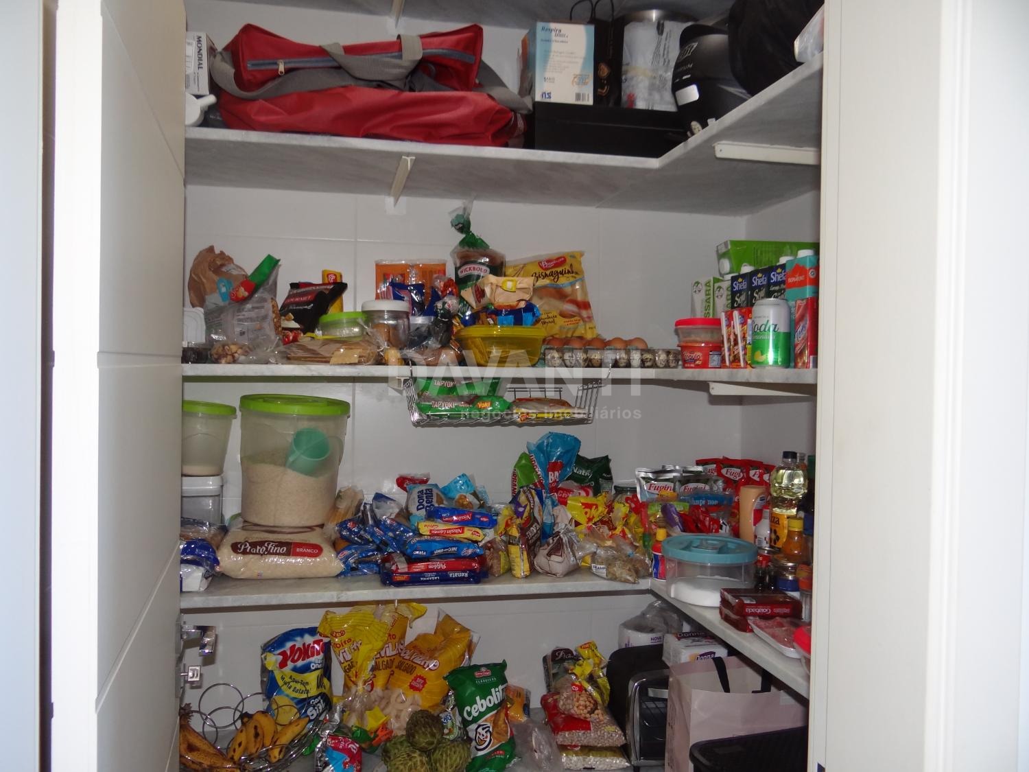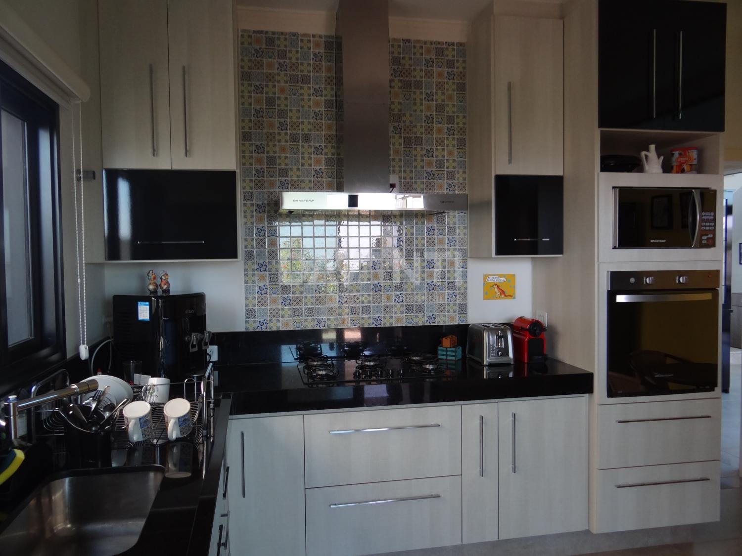 Cozinha planejada com coifa Brastemp, despensa, cristaleira com puxadores Swarovski, apoio de entrada para adega e área de serviço completa.