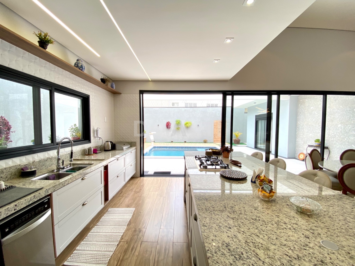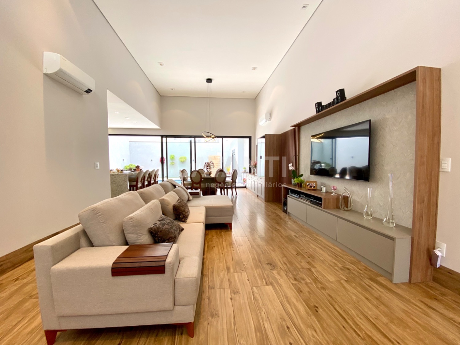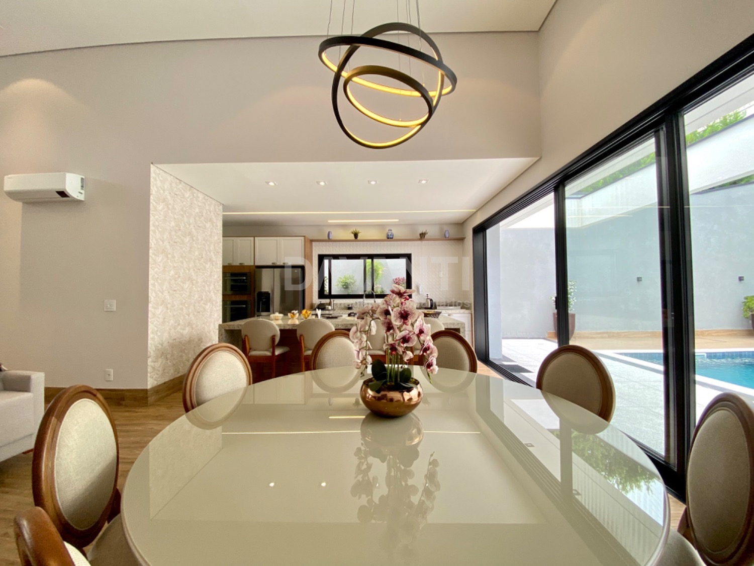 Casa nova, recém construída, projeto moderno e diferenciado, pé direito alto, ambientes amplos e integrados, muito bem distribuídos e arejados, iluminação e ventilação natural, fino acabamento, rico em armários planejados, piso em porcelanato, projetos luminotécnico, aquecimento, ar condicionado, cisterna com 5.000 litros, energia fotovoltaica de 900 kwh, telha sanduíche, pintura em projetado granfino e cimento queimado. São 4 suítes, sendo 1 master com amplo closet e cubas dupla. Living amplo para 3 ambientes, lavabo, cozinha americana toda planejada e com churrasqueira, despensa, área de serviço, piscina aquecida, tratamento de ozônio, com iluminação em Led e cascata, quintal e garagem para 6 carros.