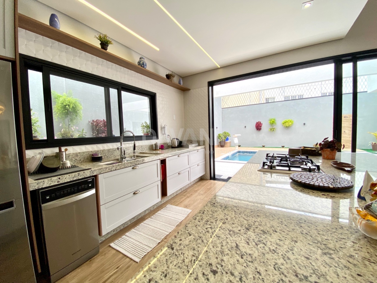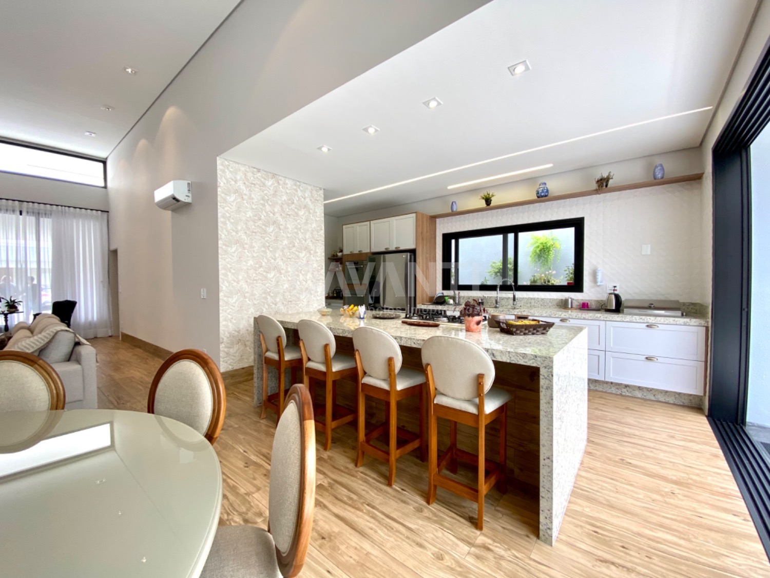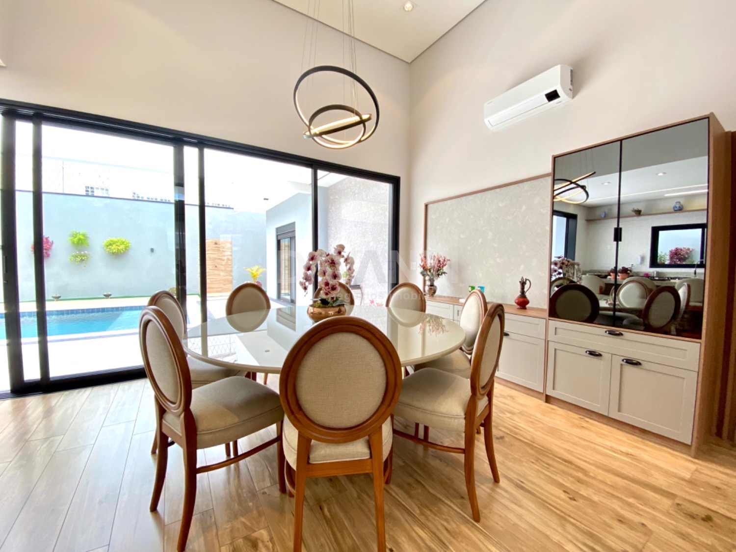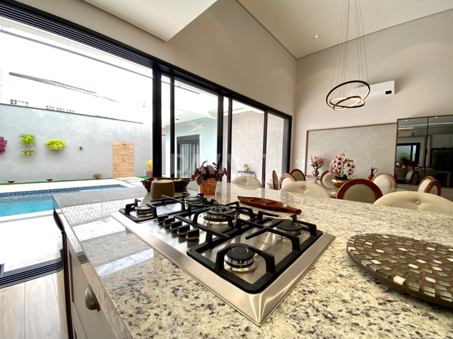 Casa nova, recém construída, projeto moderno e diferenciado, pé direito alto, ambientes amplos e integrados, muito bem distribuídos e arejados, iluminação e ventilação natural, fino acabamento, rico em armários planejados, piso em porcelanato, projetos luminotécnico, aquecimento, ar condicionado, cisterna com 5.000 litros, energia fotovoltaica de 900 kwh, telha sanduíche, pintura em projetado granfino e cimento queimado. São 4 suítes, sendo 1 master com amplo closet e cubas dupla. Living amplo para 3 ambientes, lavabo, cozinha americana toda planejada e com churrasqueira, despensa, área de serviço, piscina aquecida, tratamento de ozônio, com iluminação em Led e cascata, quintal e garagem para 6 carros.
