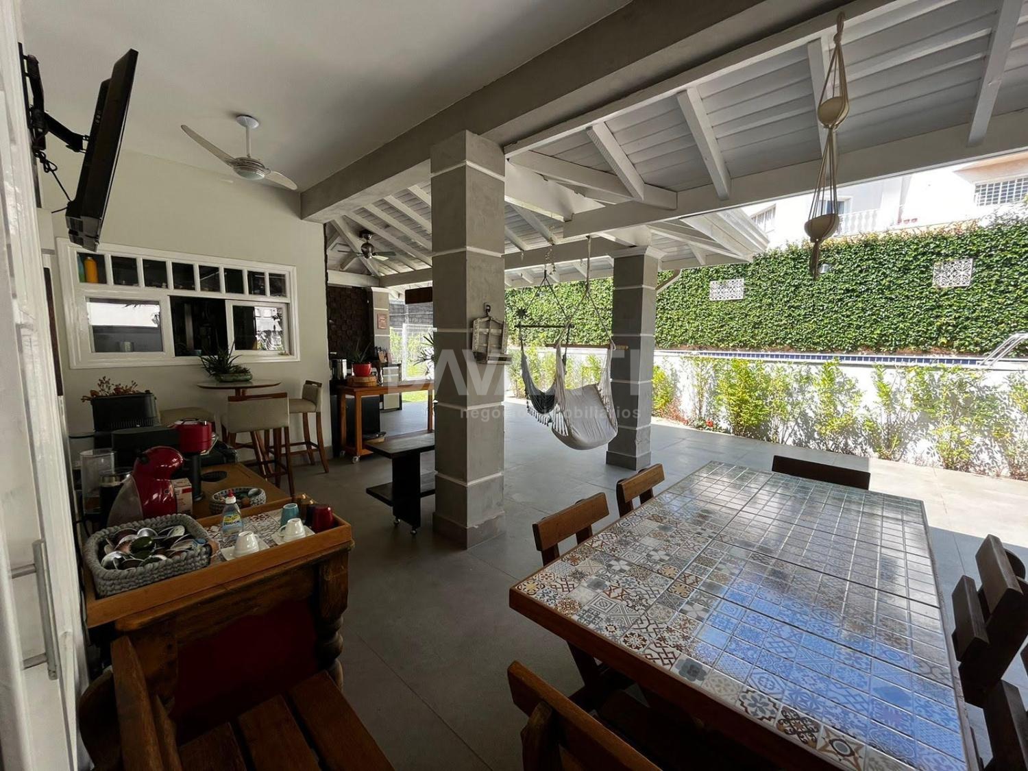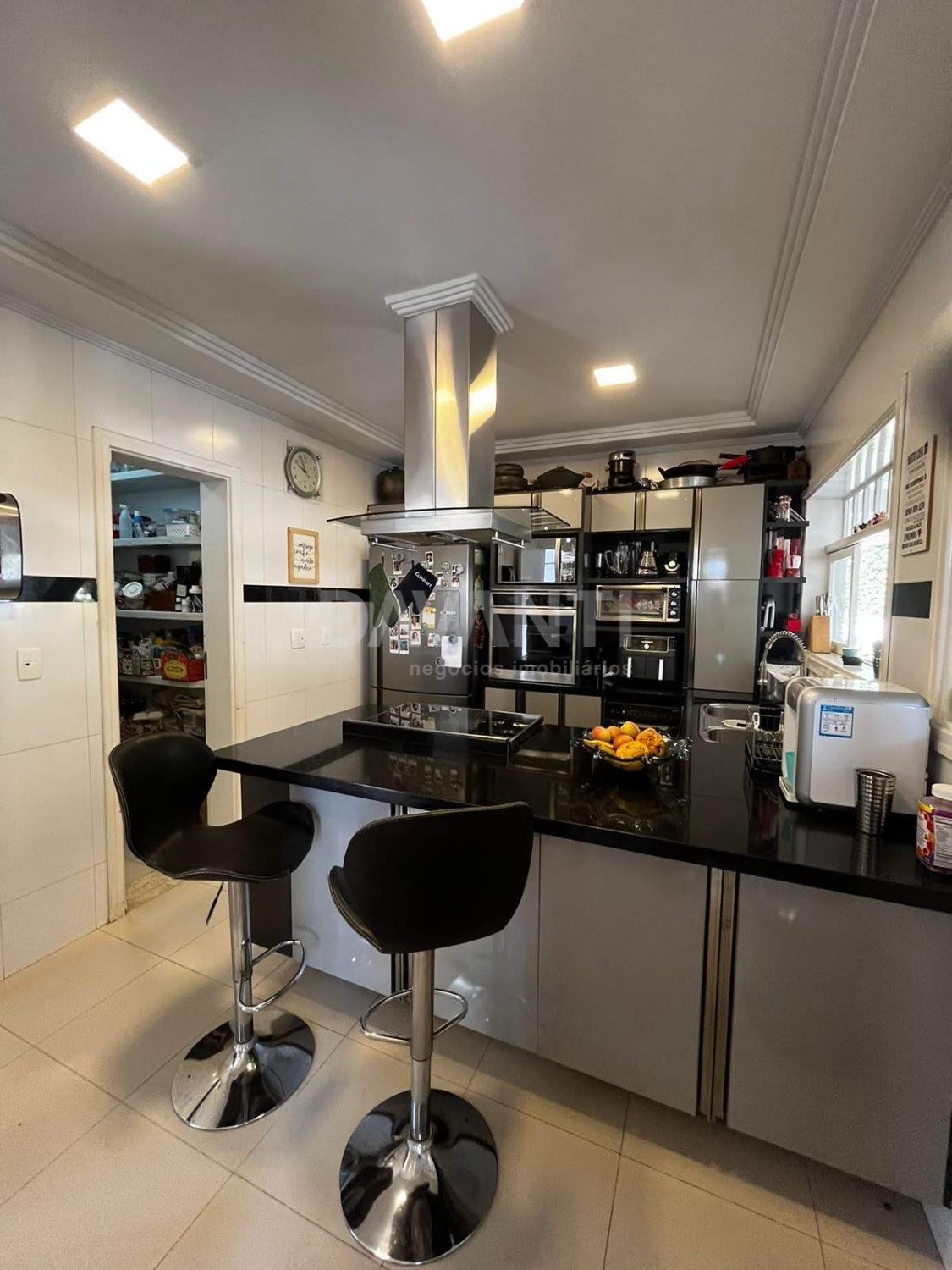 A casa ainda possui duas vagas cobertas e mais duas descobertas, área de serviço planejada, banheiro de apoio e dormitório para funcionário.