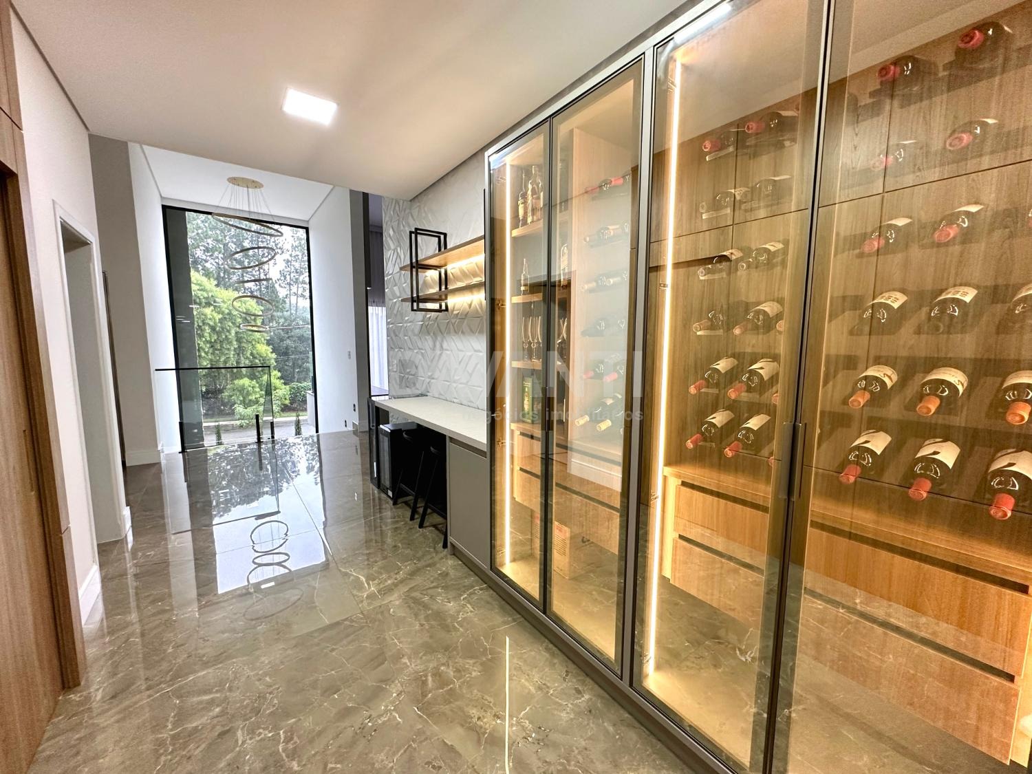 Piso superior com sala de estar, sacada, adega, sala de leitura com lareira, lavabo, sala de tv reversível para 5ª suíte, sala de jantar, ampla cozinha americana com ilha, despensa, área de serviço, espaço gourmet com churrasqueira, banheiro externo de apoio e piscina aquecida.