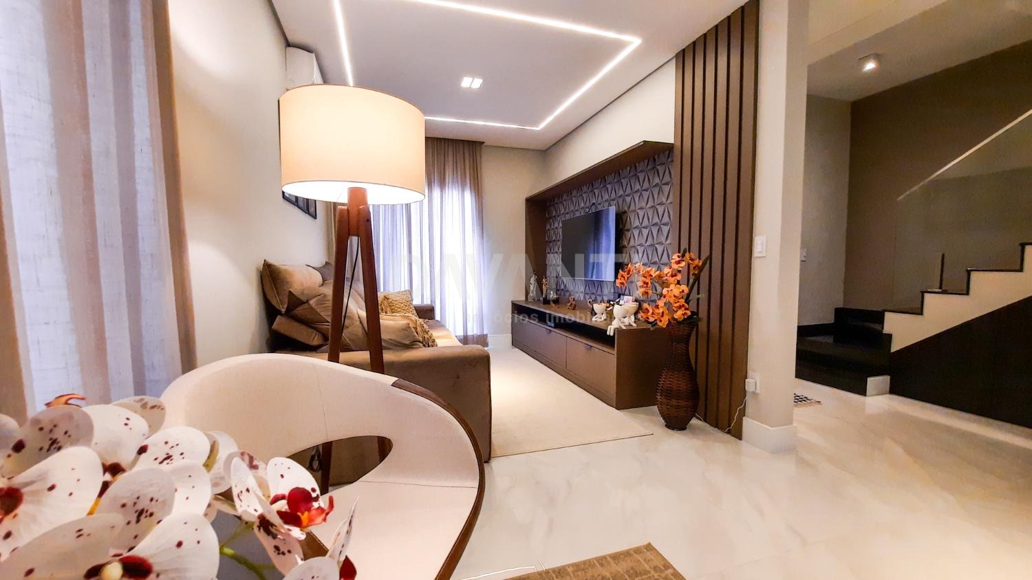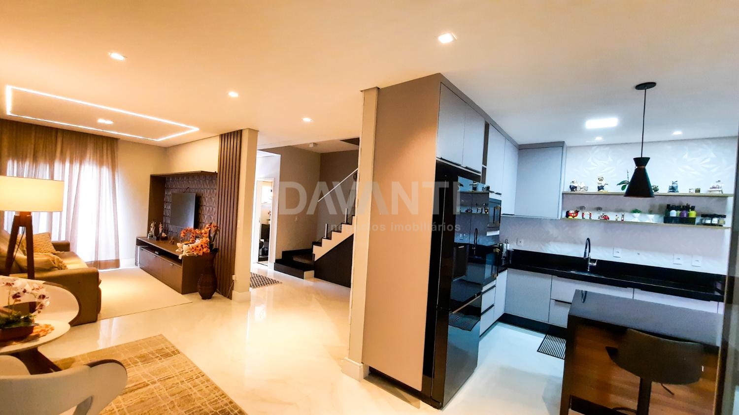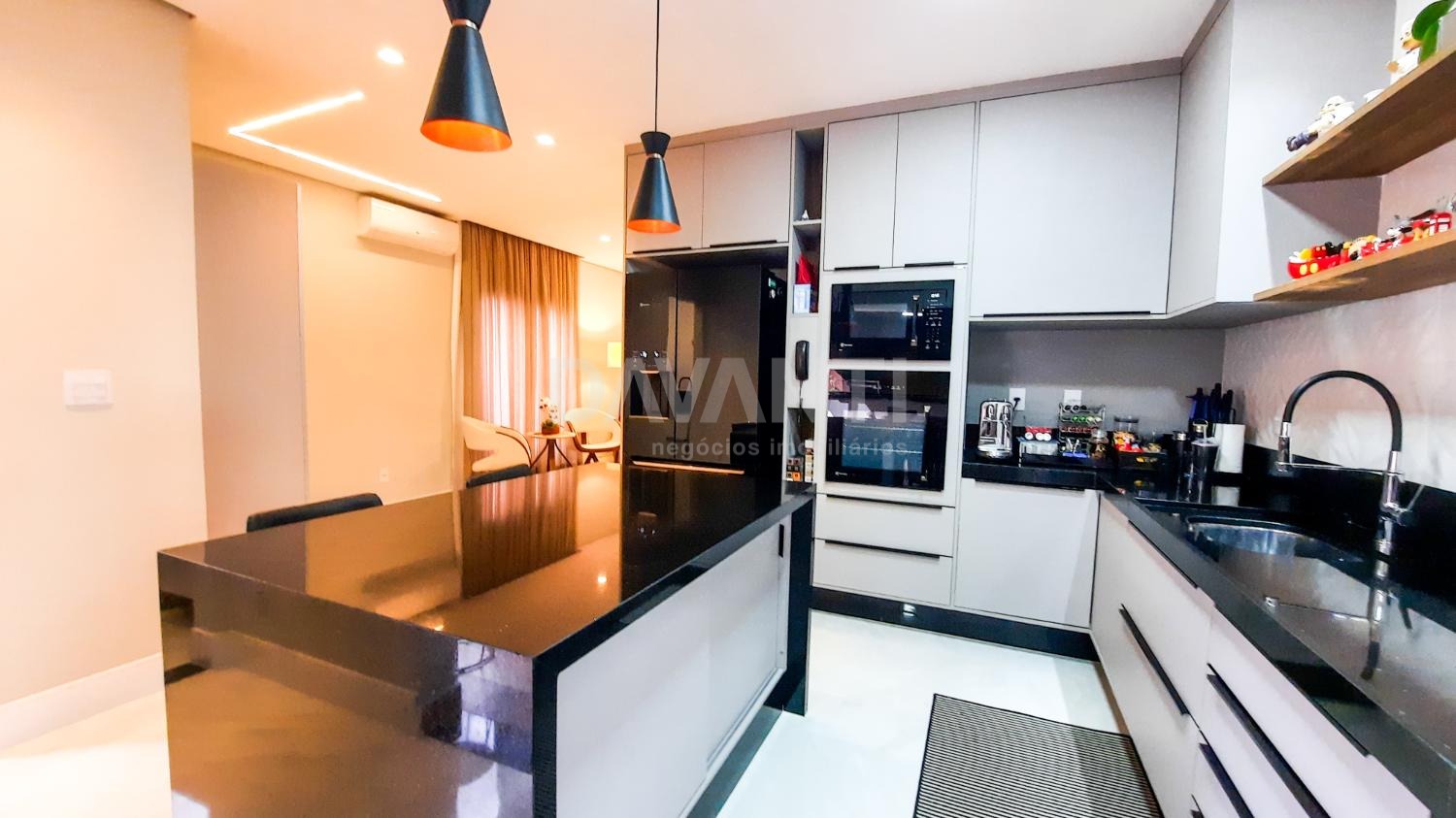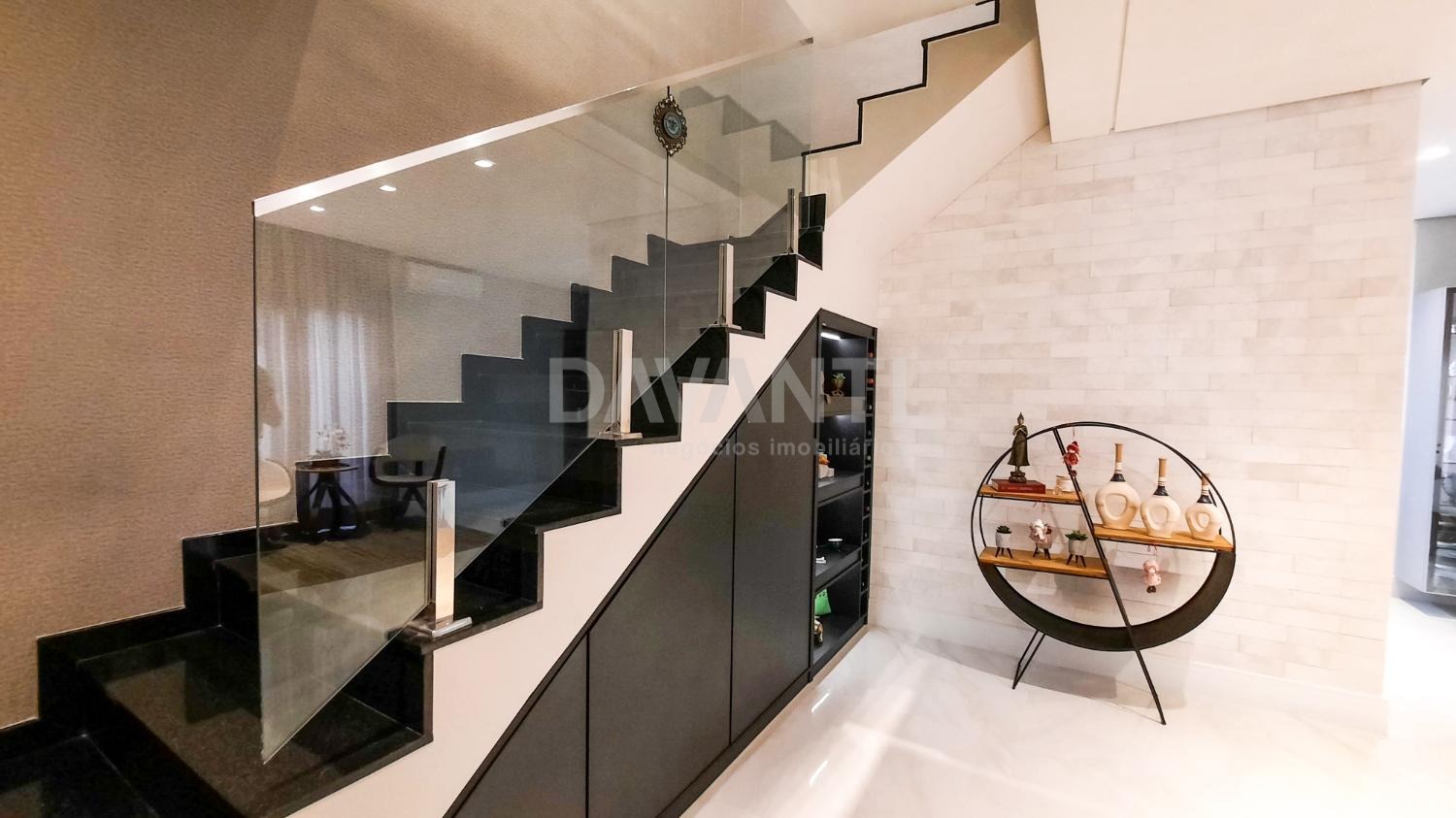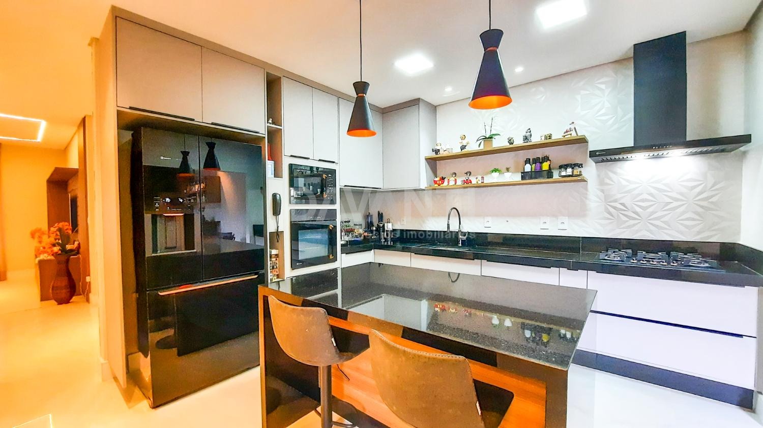 A casa foi totalmente reformada e possui o que há de melhor em acabamento, marcenaria e projeto luminotécnico que enriquece e traz sofisticação à cada ambiente desse imóvel. A sala para dois ambientes já possui com ar condicionado e móvel planejado, lavabo, cozinha estilo americana toda planejada, torre quente, cooktop e coifa. A lavanderia possui armários. Integrado à cozinha está a área gourmet moderníssima, fechada com vidros com churrasqueira, ventilador de teto e ar condicionado.