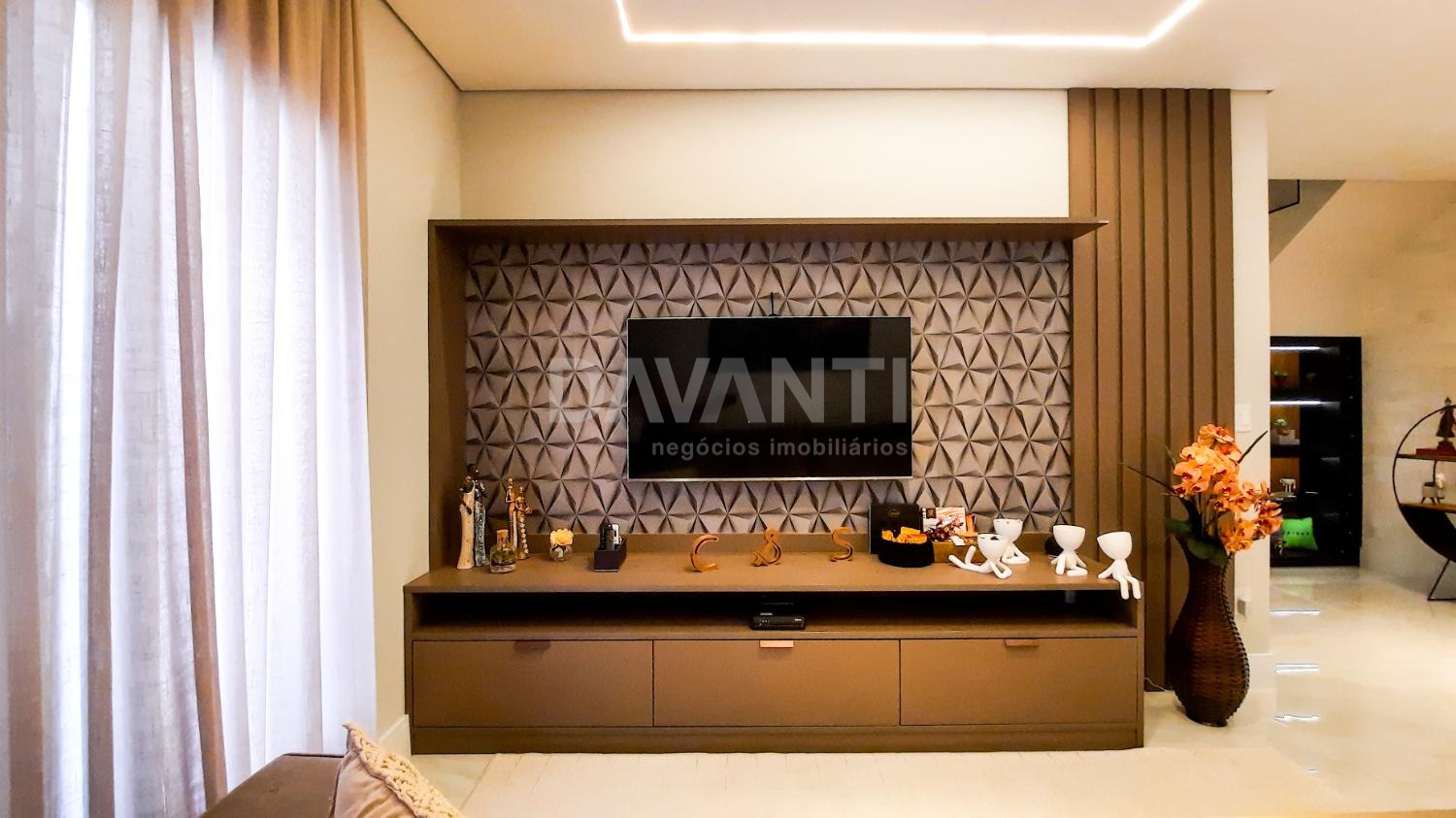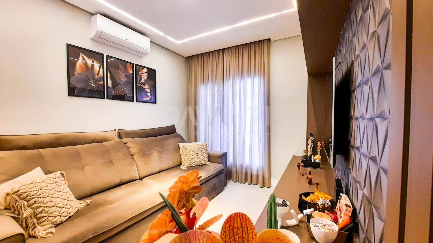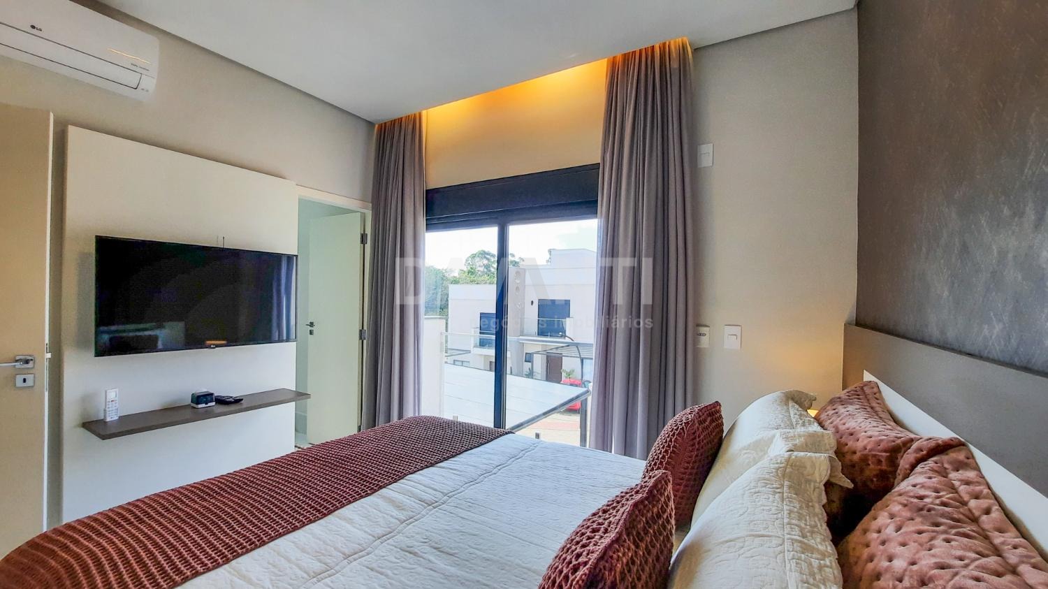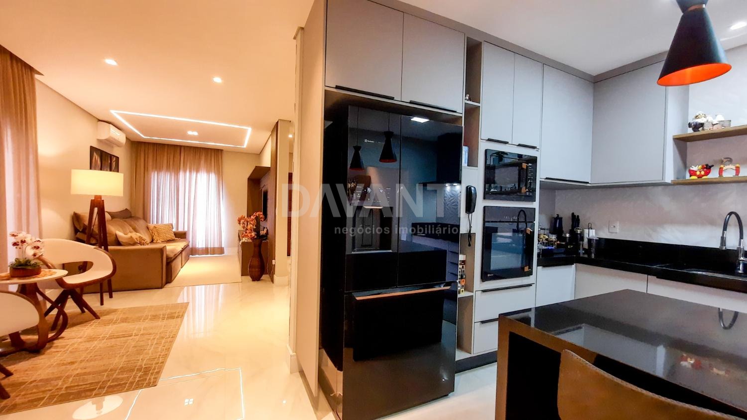 A casa foi totalmente reformada e possui o que há de melhor em acabamento, marcenaria e projeto luminotécnico que enriquece e traz sofisticação à cada ambiente desse imóvel. A sala para dois ambientes já possui com ar condicionado e móvel planejado, lavabo, cozinha estilo americana toda planejada, torre quente, cooktop e coifa. A lavanderia possui armários. Integrado à cozinha está a área gourmet moderníssima, fechada com vidros com churrasqueira, ventilador de teto e ar condicionado.