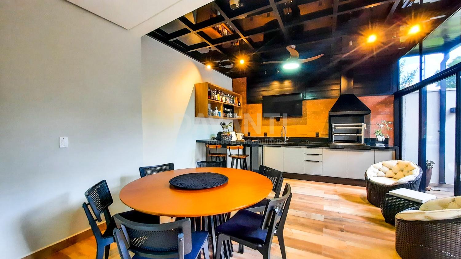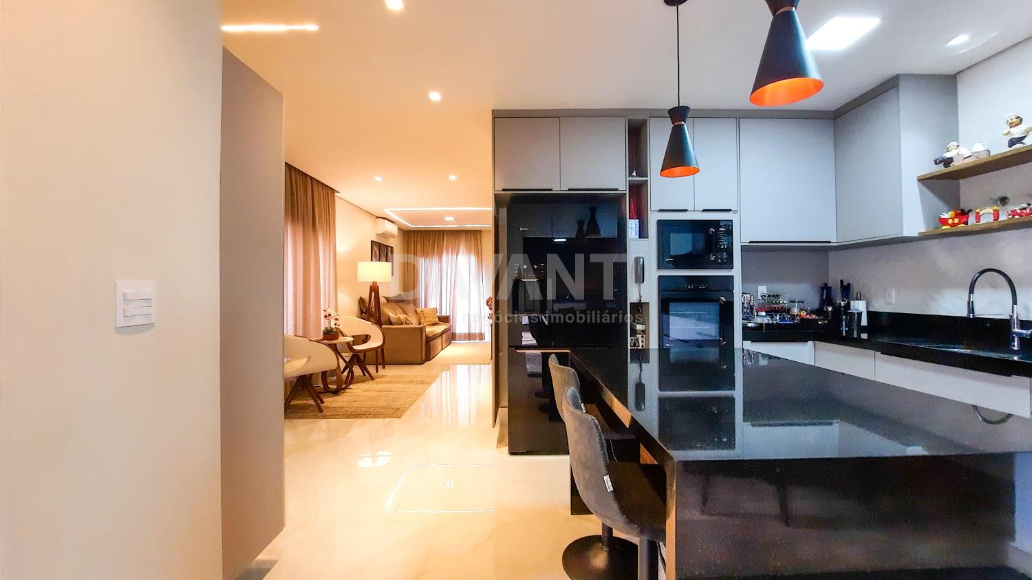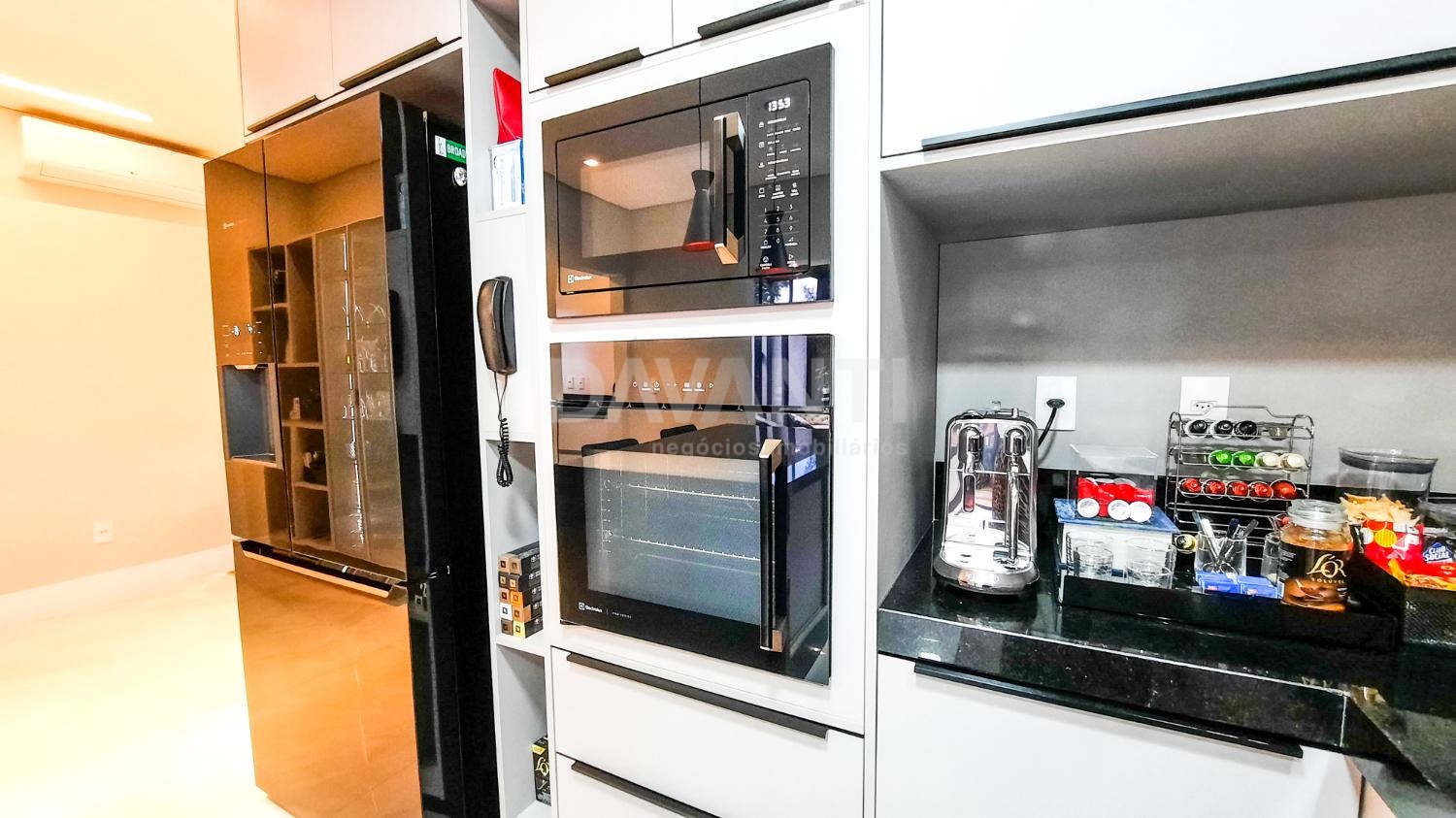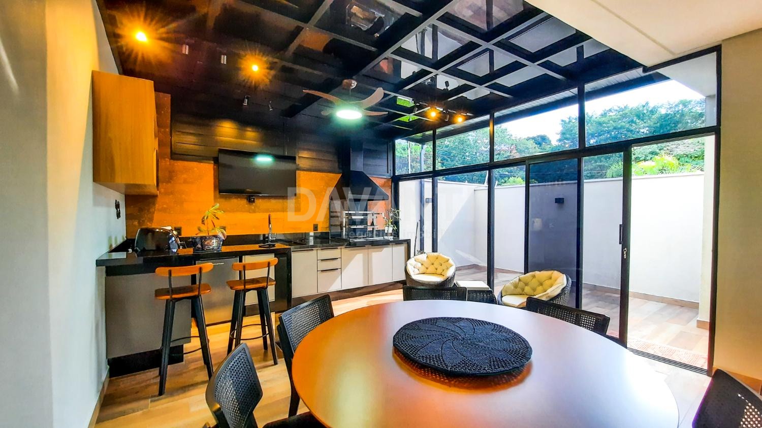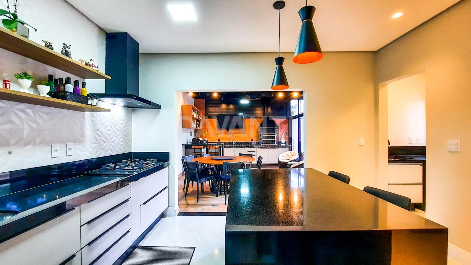 A casa foi totalmente reformada e possui o que há de melhor em acabamento, marcenaria e projeto luminotécnico que enriquece e traz sofisticação à cada ambiente desse imóvel. A sala para dois ambientes já possui com ar condicionado e móvel planejado, lavabo, cozinha estilo americana toda planejada, torre quente, cooktop e coifa. A lavanderia possui armários. Integrado à cozinha está a área gourmet moderníssima, fechada com vidros com churrasqueira, ventilador de teto e ar condicionado.