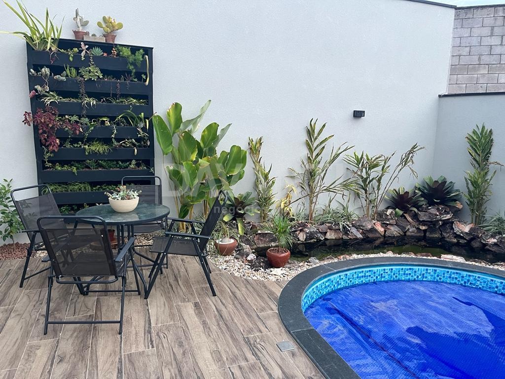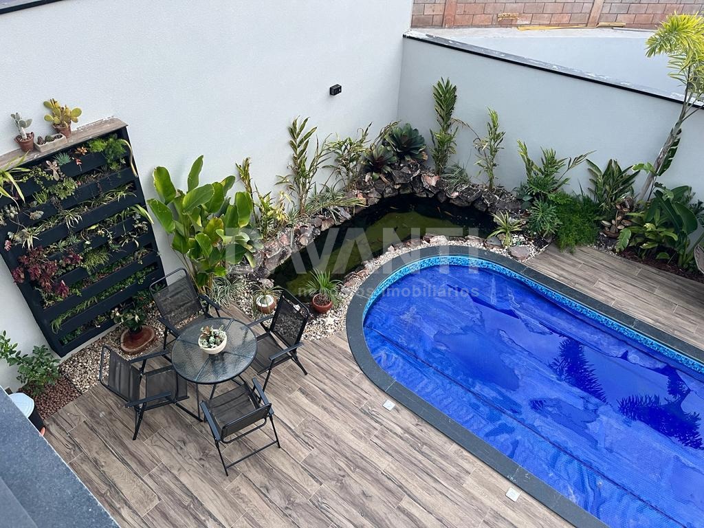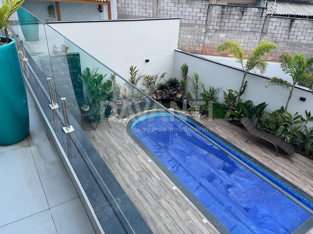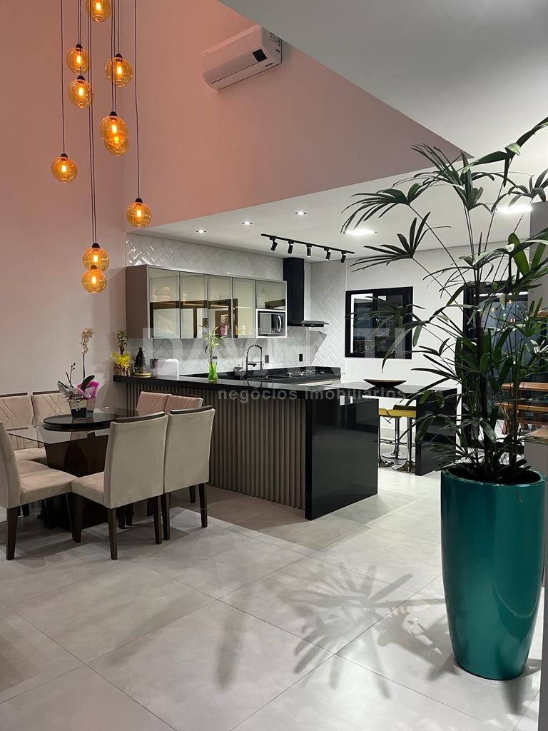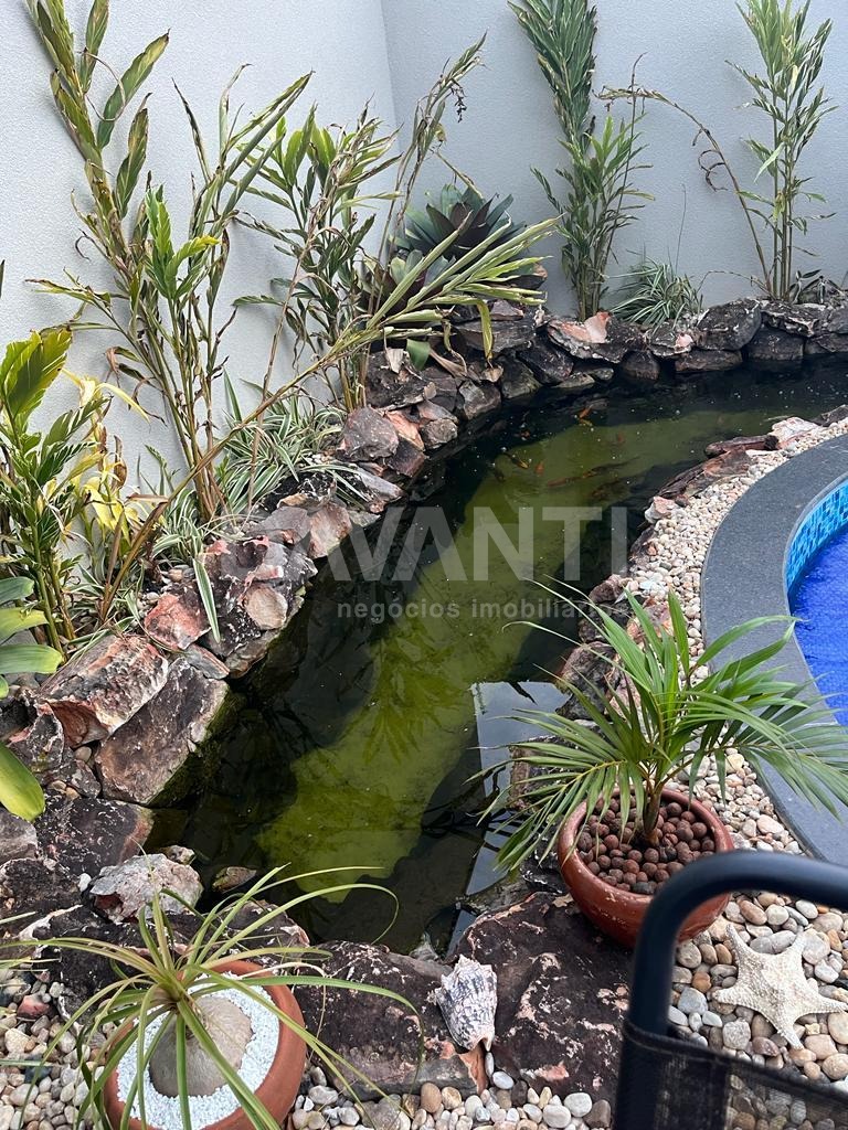 Lindo sobrado, fino acabamento, com 285 metros de construção, sendo: 4 suítes, 3 na parte superior com escritório com vista para mata, todos com ar condicionado e todos com móveis planejados, sendo 1 suíte embaixo com ar condicionado e móveis planejados. Conceito com ambientes integrados, cozinha completa com armários, cooktop, fogão embutido, exaustor, lavado interno, hall de entrada com área verde com pergolado. Lavanderia e dispensa. Área gourmet fechada com ar condicionado, piscina com aquecimento e bar molhado. Lago ornamental com carpas e outros peixes. Lavabo externo, dormitório para cachorro, fotovoltaica e boiler para 400 litros.