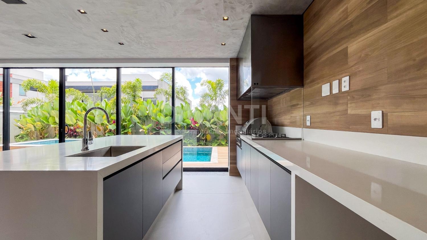 - Área gourmet fechada com vidros, equipada com churrasqueira a gás, cooktop e armários planejados Kitchens