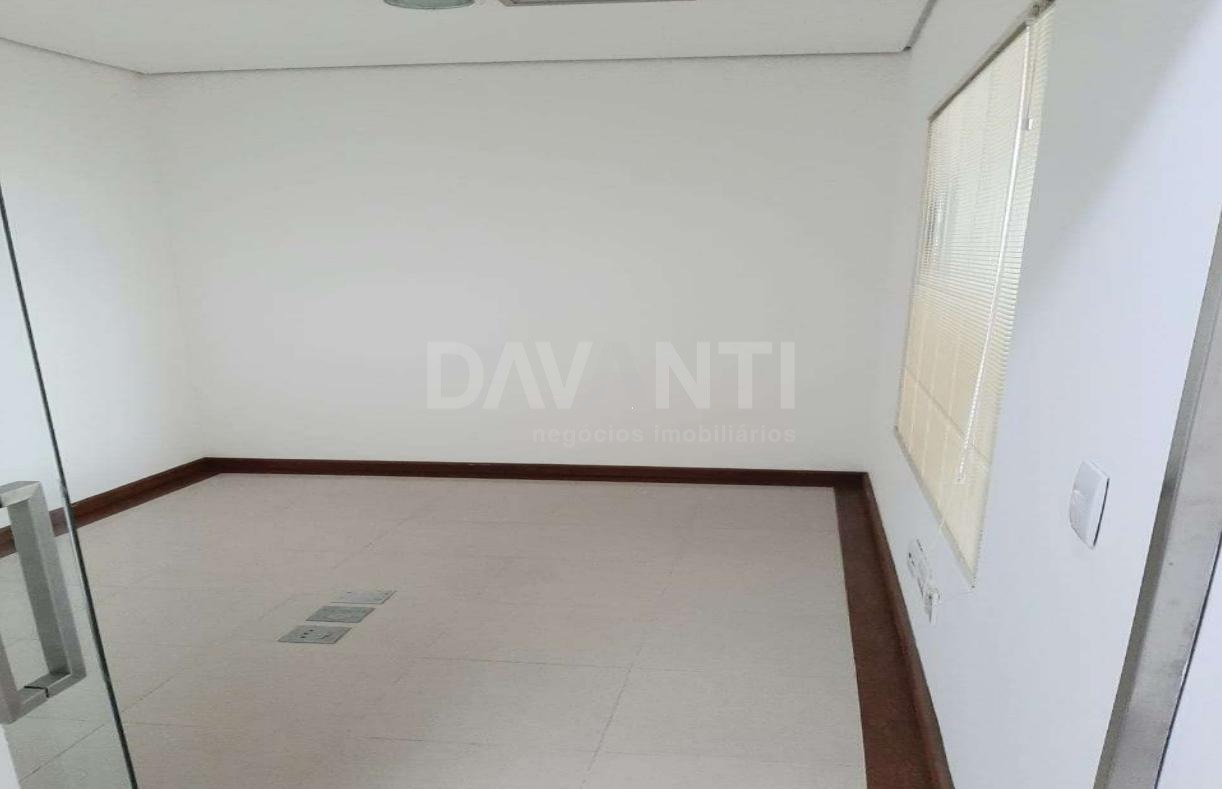 Sala comercial para locação no Centro de Campinas na Davanti Negócios Imobiliários. Com 07 salas, 02 banheiros, 02 copa, 01 vaga de garagem coberta, medidor de energia individualizado, quadro elétrico, ar condicionado central funcionando das 7:00h às 18:00h, forro metálico e paredes revestidas com pintura látex. Sanitários e copa com piso e paredes com revestimento cerâmico, forro metálico. Condomínio com AVCB, controle de acesso eletrônico com reconhecimento facial, portaria para identificação e liberação de visitantes, segurança 24 horas, 4 elevadores, sistemas de alarme de incêndio, hidrantes e sprinklers, estacionamento com manobrista e sistema de monitoramento por câmeras. IPTU: Isento em 2024, devido a lei de revitalização do Centro de Campinas. Agende sua visita com a Davanti Negócios Imobiliários.