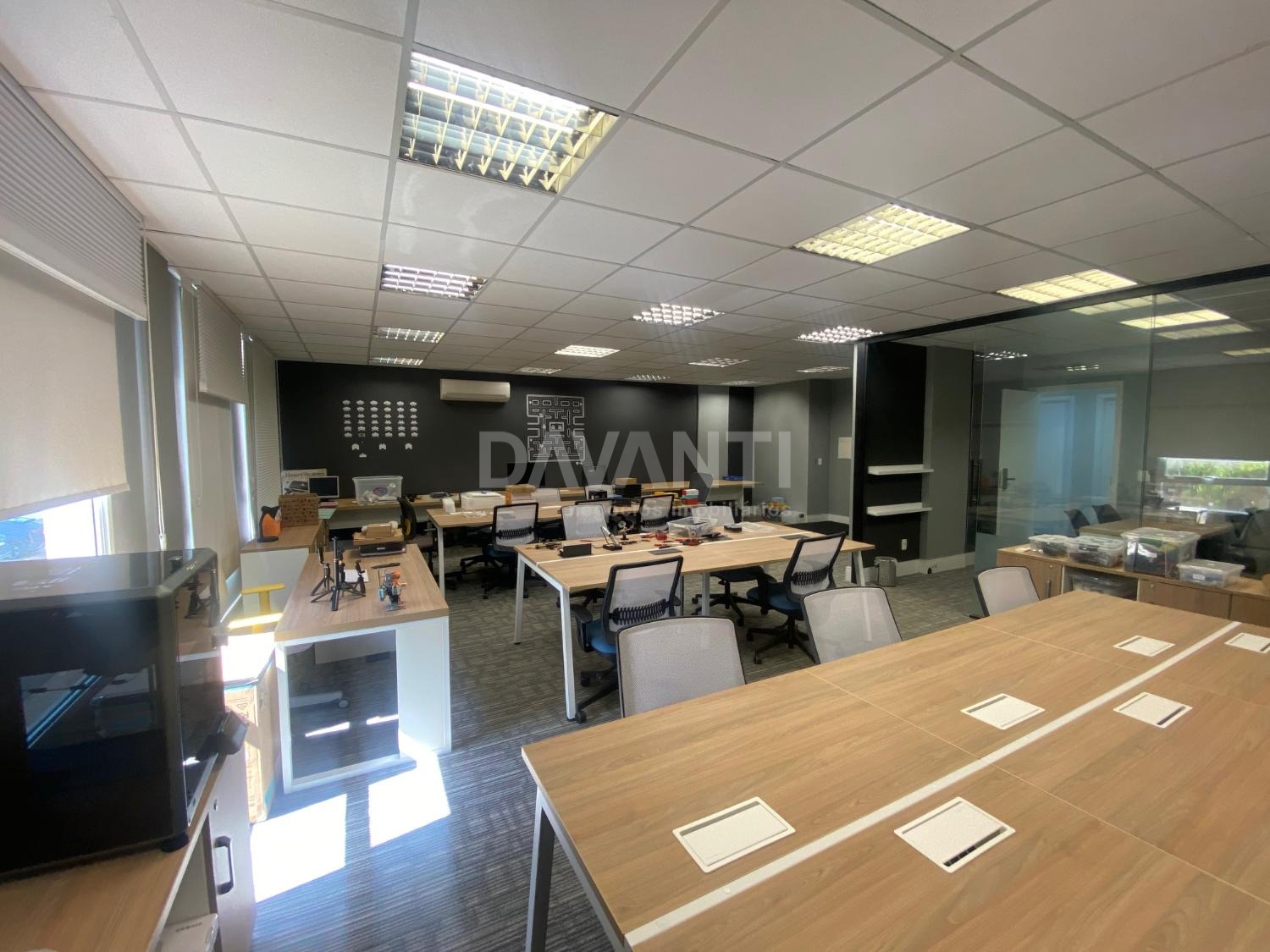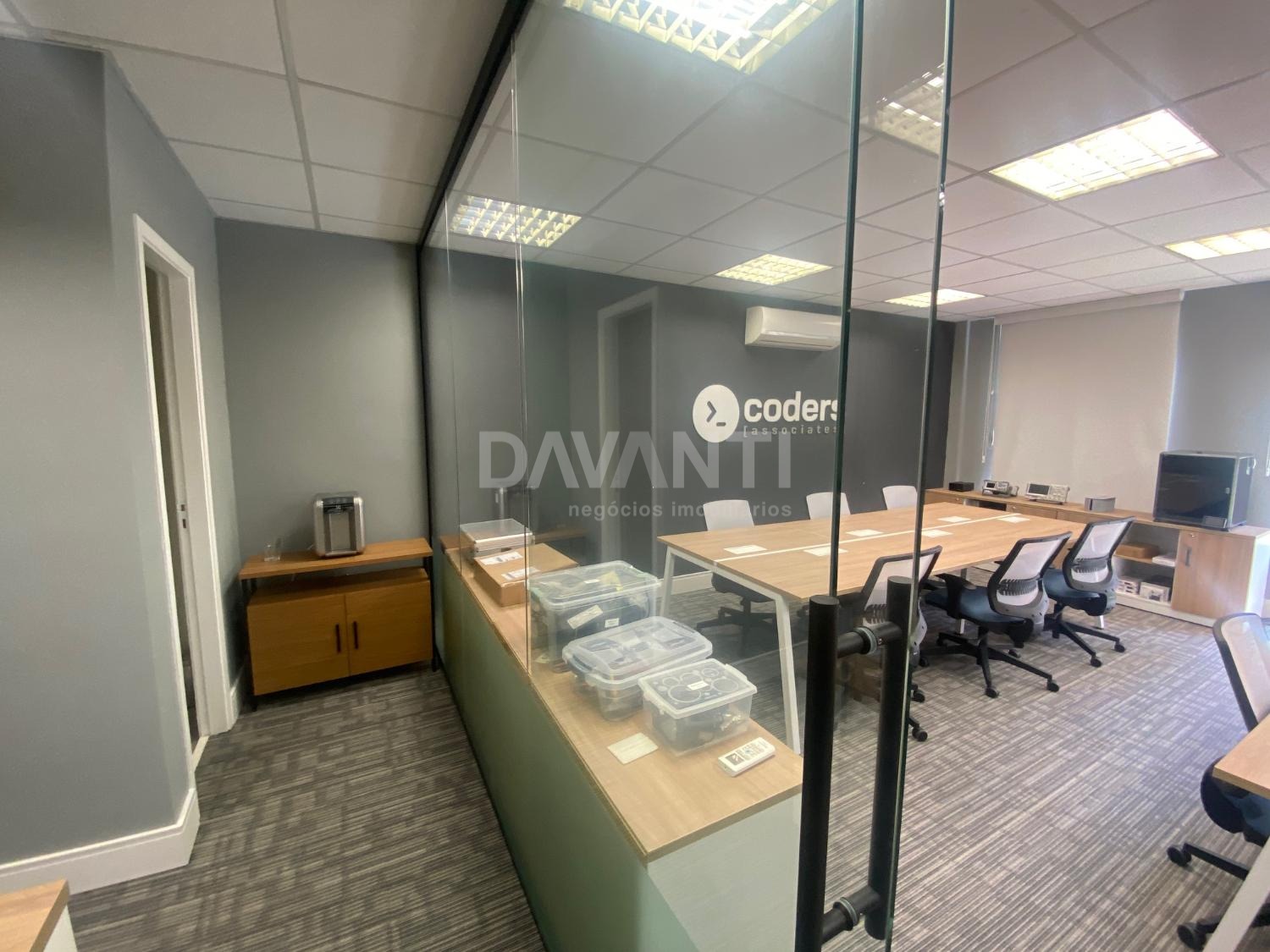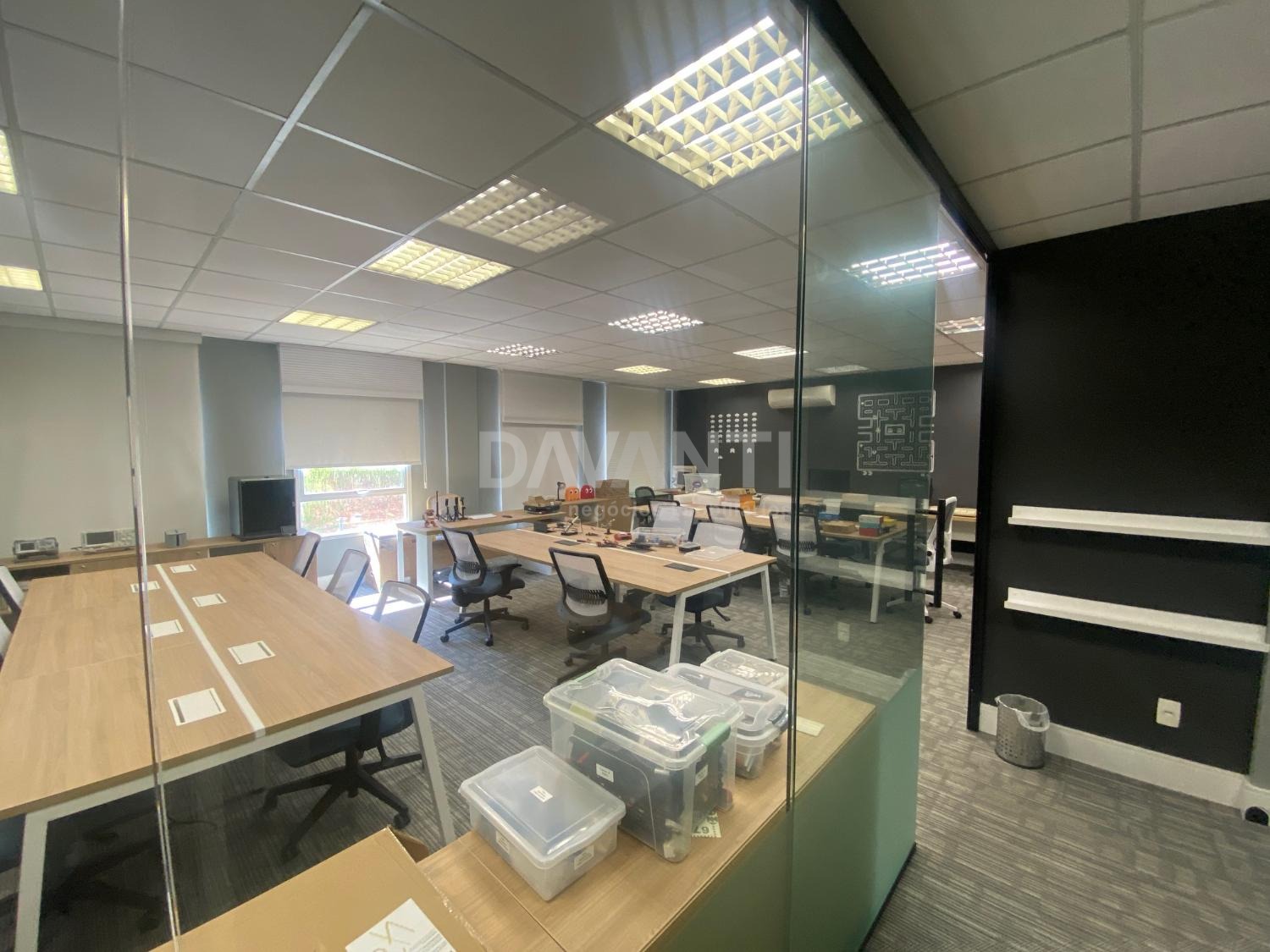 Sala para locação mobiliada mesas cadeiras e armários baixos, no Condomínio Spot Galeria em Campinas. Davanti Negócios Imobiliários. Situado em um dos melhores condomínios empresariais da cidade, com acesso direto ao Shopping Galleria, com paisagismo e infraestrutura de primeira qualidade. Salas conjugadas de 80 m² com recepção, ar condicionado, 1 banheiros e Ideal para escritórios, consultórios entre outros, com 2 vagas de garagens, tem o valet do Spot que faz preço especial para mensalistas. Pode-se usar o estacionamento do shopping e entrar direto pela passarela. Agende sua visita com a Davanti Negócios Imobiliários.
